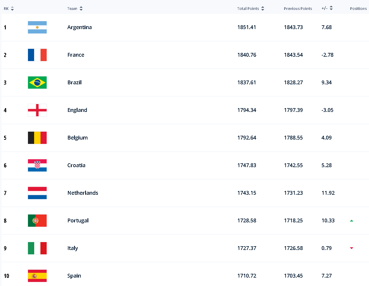 1위는 아르헨티나, 2위 프랑스, 3위 브라질로 남아메리카 나라의 강세가 주목할만합니다. 하지만 10위권 안에 대부분이 유럽이 차지하고 있습니다.
