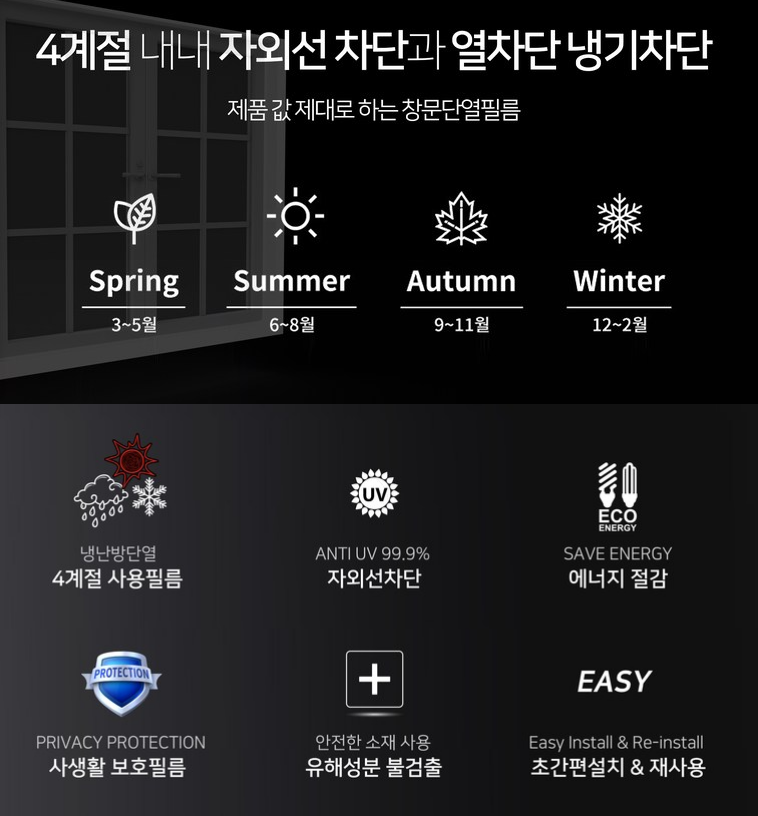 열차단시트지는 한 번 부착하면 장기간 유지가 가능하며, 물 분사후 부착하는 무점착 방식은 누구나 쉽게 설치할 수 있습니다. 대신 사용 기한이 있어 일정 기간 사용 후엔 새것으로 교체를 해주어야 합니다. 교체를 위해 제거할 경우 유리 표면에 자국이 남을 수 있어 깨끗하게 제거하는 것이 관건입니다.