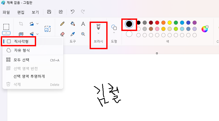 그림판을 열어서 하얀 도화지에 위에, 브러시와 까만색을 선택합니다.